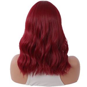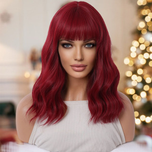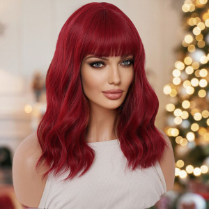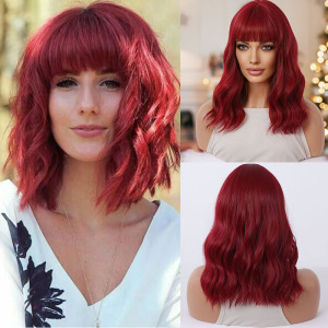 亚马逊跨境热销齐刘海酒红色羊毛卷短卷发蓬松化纤女士全头套假发