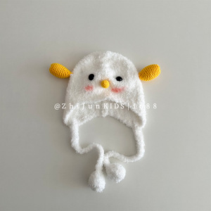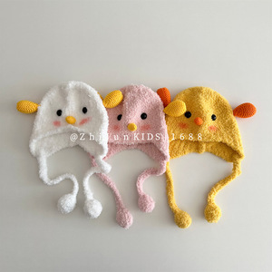 婴幼童可爱卡通小黄鸡毛绒护耳帽宝宝加厚保暖防风针织系带包头帽