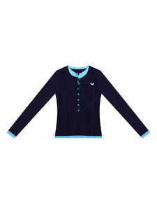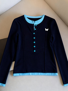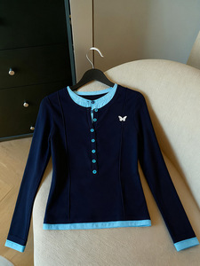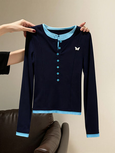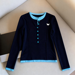 藏青色亨利领假两件正肩长袖t恤女早秋季修身内搭打底衫撞色上衣