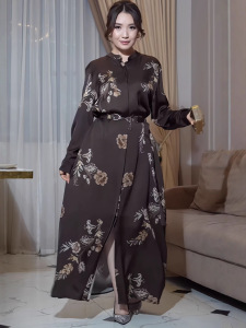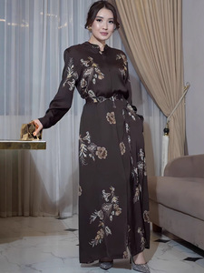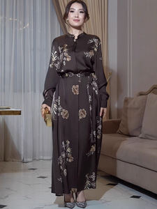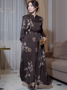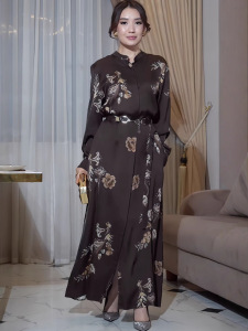 亚马逊2025欧美跨境秋季新款印花时尚收腰气质女装长袖连衣裙