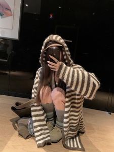 慵懒风软糯条纹连帽长袖针织开衫2025秋季新款宽松复古毛衣外套女