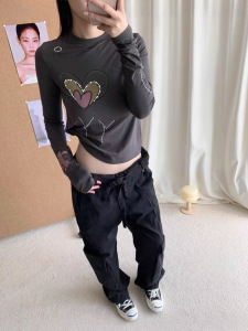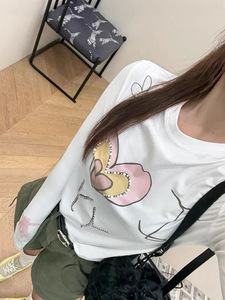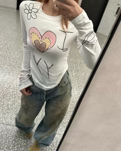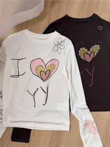 现货open yy韩国小众25早秋新款撞色爱心字母印花钉珠圆领长袖T恤