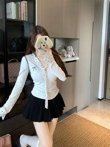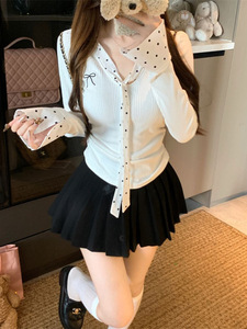 白色波点拼接polo领内搭打底衫女早秋季新款修身短款长袖t恤上衣