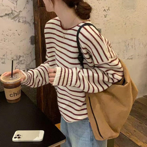 韩系条纹长袖针织衫女2025秋冬新款宽松百搭套头毛衣洋气软糯上衣