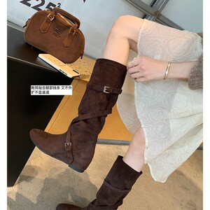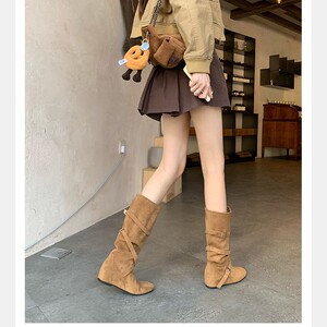 牛皮版~葡萄妈复古增高韩系西部牛仔靴子圆头显瘦堆堆靴中筒靴女