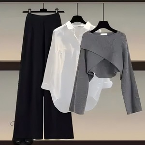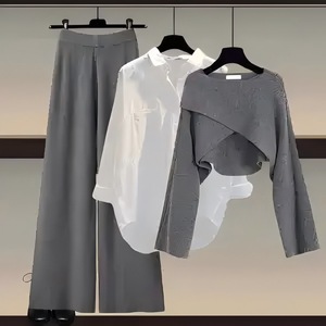 灰毛衣+白衬衫+黑色阔腿裤 三件套