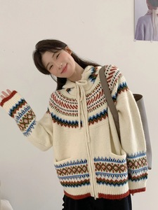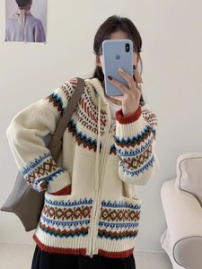 复古费尔岛氛围感连帽毛衣外套女2025新款秋冬慵懒风宽松针织开衫
