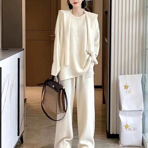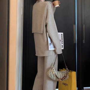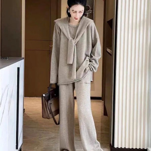 秋冬新款宽松显瘦套头针织套装女年直筒阔腿长裤纯色三件套潮百搭
