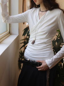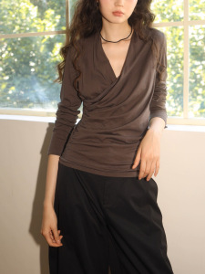 素舶 奥地利莫代尔羊毛混纺轻盈柔软透气v领堆褶收腰显瘦长袖上衣