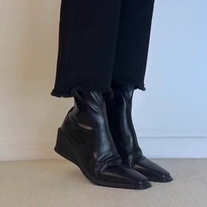 羊皮版~真皮方头坡跟英伦风复古短靴女秋冬加绒黑色瘦瘦靴马丁靴