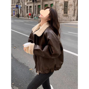 美式复古咖色机车皮衣外套女冬季加绒加厚新款羊羔毛拼接保暖宽松