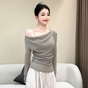 时尚气质套装女2025秋季新款感斜领露肩长袖T恤阔腿裤两件套