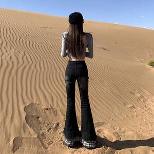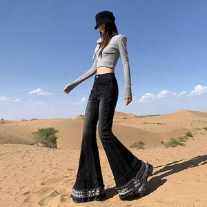 批发代发辣妹格子拼接微喇叭牛仔裤女秋季设计感毛边马蹄喇叭裤