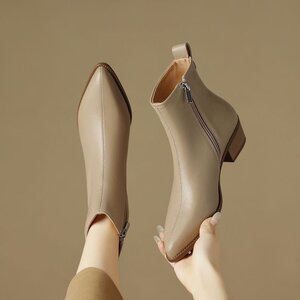 法式软皮尖头短靴女秋冬新款中跟显瘦百搭马丁靴粗跟软皮加绒单靴