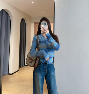 时髦显瘦花色条纹衫羊毛混纺竖坑条短款针织开衫女2025秋G092401