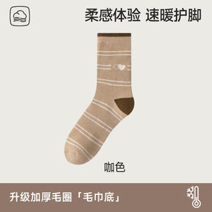 秋冬女士中筒袜加绒加厚保暖爱心毛巾地板袜休闲罗口条纹毛圈袜子
