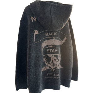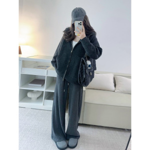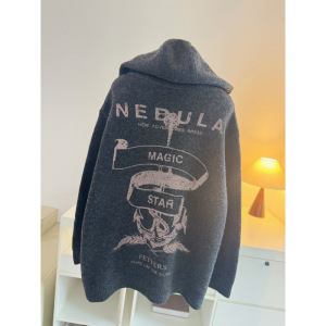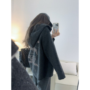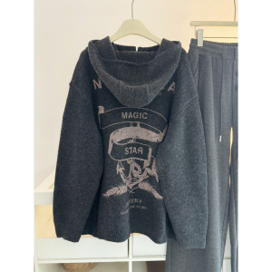塞纳连帽灰色厚毛衣外套后背印花羊毛针织开衫+休闲慵懒裤子套装