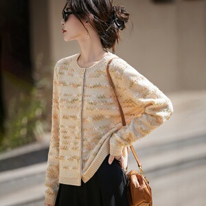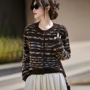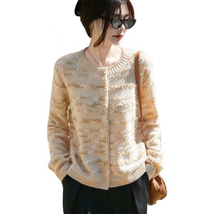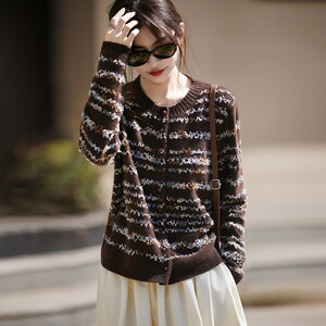 杏色条纹流苏肌理感针织开衫女秋冬新款毛衣外套女装圆领上衣