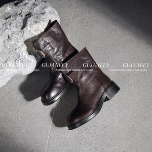 欧洲站女鞋25秋冬时尚软褶皱植鞣胎牛皮圆头休闲套筒切尔西皮短靴