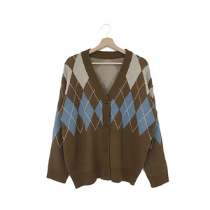 现huo 韩国ins 早秋 学生 宽松 V领 菱形格 针织衫女毛衣外套
