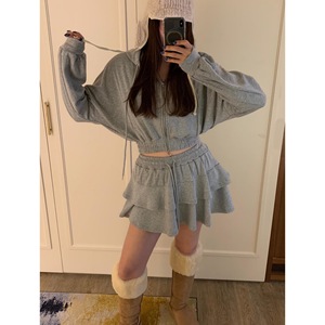 韩国2025秋季新款宽松百搭休闲连帽卫衣外套+蛋糕短裙套装女