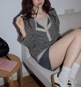 韩系假两件翻领黑色条纹T恤女2025秋慵懒宽松休闲长袖上衣