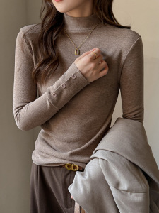 严选半高领纽扣修身长袖T恤女秋季辣妹设计感百搭显瘦打底衫上衣