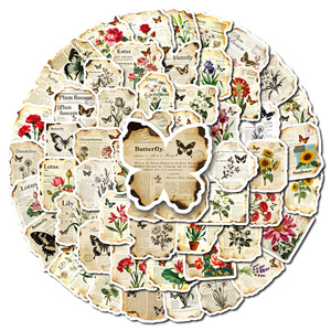 56张跨境新款复古报纸风蝴蝶花卉手稿涂鸦贴纸创意烧焦手账素材贴