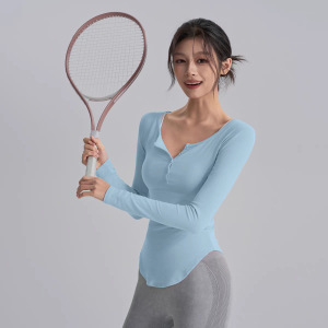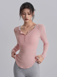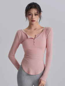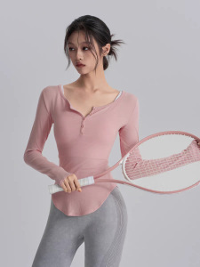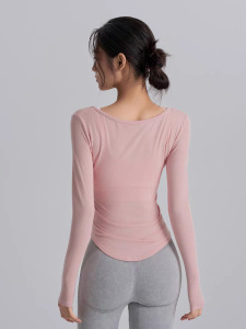 秋冬V领瑜伽长袖纯色简约训练健身运动普拉提上衣户外跑步透气速