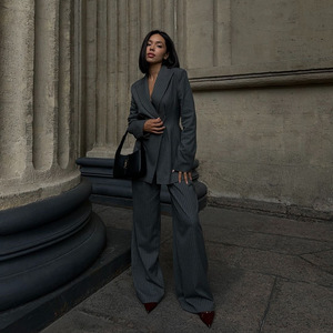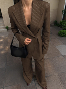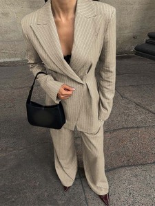 2025跨境秋季时尚新款女装翻领条纹长袖套装通勤百搭西装外套长裤