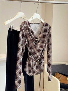 纯欲甜美网纱格子印花小衫女chic秋季设计感修身短款百搭打底上衣