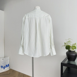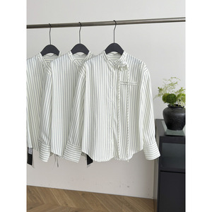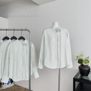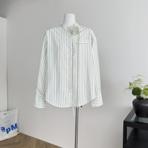 秋上新!时髦设计感立体花朵立领撞色条纹衬衫上衣