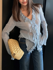 法式花瓣v领蓝色女士衬衫早秋高级设计感外套长袖上衣