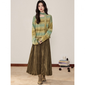 法式复古撞色条纹设计感针织毛衣褶皱半身裙两件套高级感轻奢套装