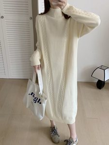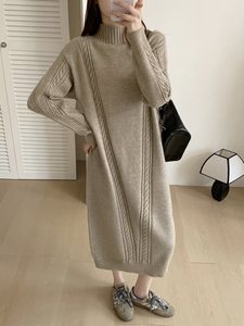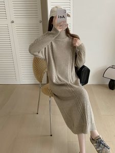 跨境外贸秋冬新款宽松半高领毛衣裙时尚长款针织内搭打底连衣裙女