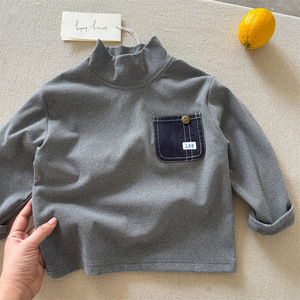 新款儿童高领打底衫字母男童保暖套头衫1-6岁宝宝秋冬T恤撞色口袋