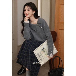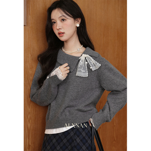「温柔姐系」灰色套头毛衣秋冬女新款蕾丝长袖宽松针织衫衣外套