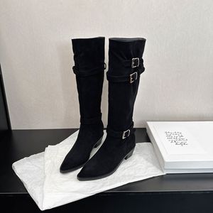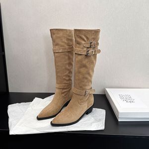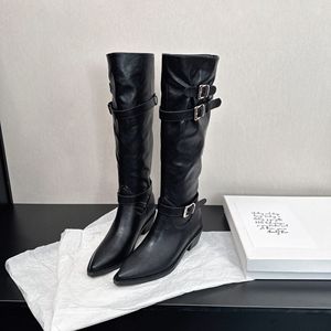 真皮内增高复古皮带扣粗跟长筒靴不过膝显瘦骑士靴尖头褶皱堆堆靴