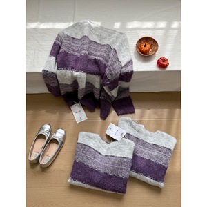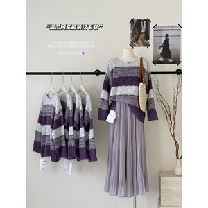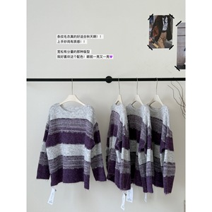 韩系氛围感穿搭紫色条纹套头毛衣女2025秋冬宽松慵懒感斜肩针织衫