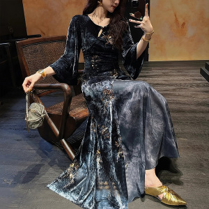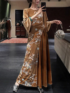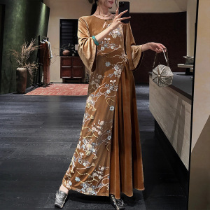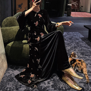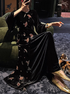 【朝夕】丝绒珠片绣花旗袍拼接连衣裙
