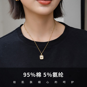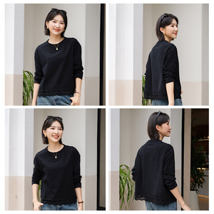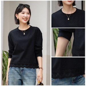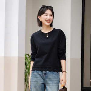 YUN韫秋季纯棉长袖打底衫圆领长袖下摆拼接设计感刺绣花边叠穿