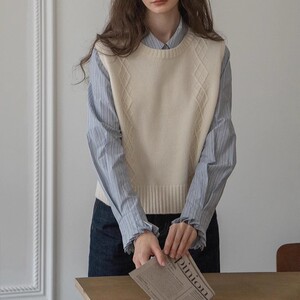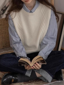 Dailyat“云朵托卡”全羊毛圆领绞花背后开叉针织马甲背心