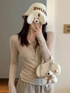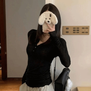韩系半开领修身花边长袖t恤女2025新款春秋通勤显瘦日常简约上衣
