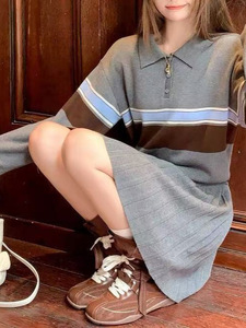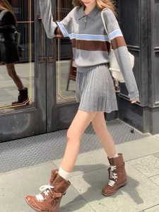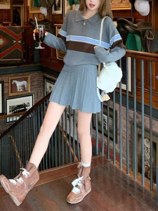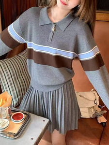 韩系学院风灰色polo领条纹针织衫女秋长袖毛衣上衣裙子套装