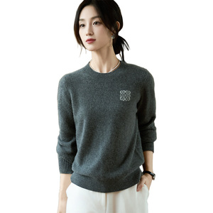 软糯精纺细羊毛衫女圆领刺绣纯色打底衫上衣宽松套头纯羊毛衫毛衣