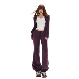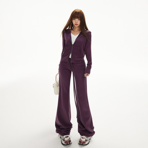 【今茵】美式慵懒风修身显瘦连帽外套抽绳微喇裤子百搭休闲套装女