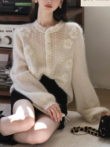 杏花雨马海毛羊毛立体手工勾花镂空圆领毛衣外套秋
