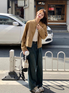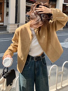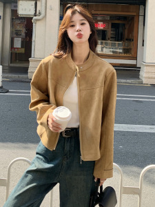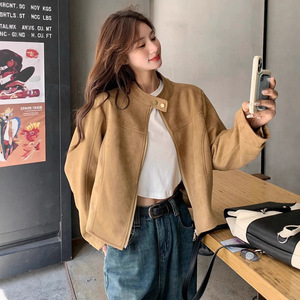 美式复古立领仿麂皮绒短款外套女春秋飞行夹克又酷又飒小个子上衣