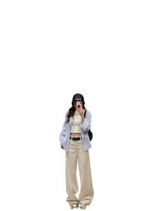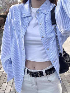 复古港风条纹衬衫女春秋新款蓝色衬衣韩版ins宽松休闲开衫外套潮1
