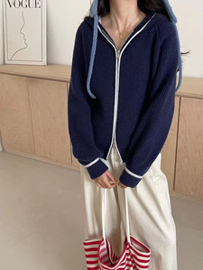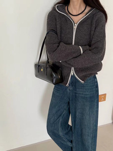 连帽双拉链毛衣外套女2025秋冬新款韩系撞色边针织开衫小个子穿搭
